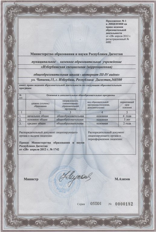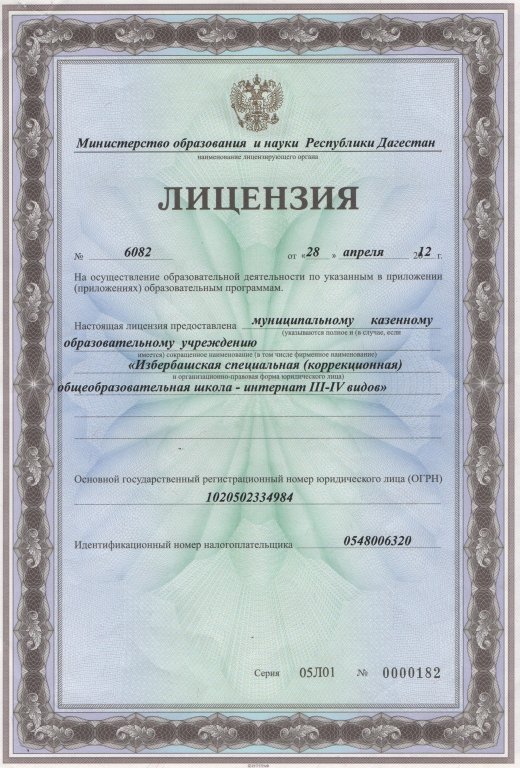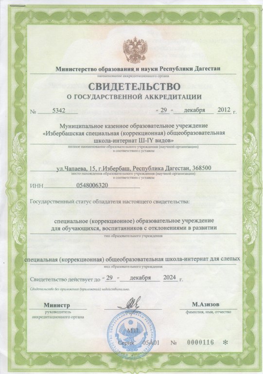 | Полное наименование образовательной организации* | Муниципальное казённое общеобразовательное учреждение Избербашская школа - интернат III-IV видов |